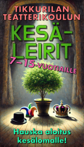 Viikon mittainen teatterikurssi on hauska aloitus kesälomalle ja samalla tilaisuus tutustua uusiin ystäviin. Tikkurilan teatterikoulun kesäkursseille voivat osallistua niin teatterin vasta-alkajat kuin kokeneet konkaritkin, ja leiriviikko on oivallinen tilaisuus kokeilla, voisiko teatteri olla se oma juttu.
